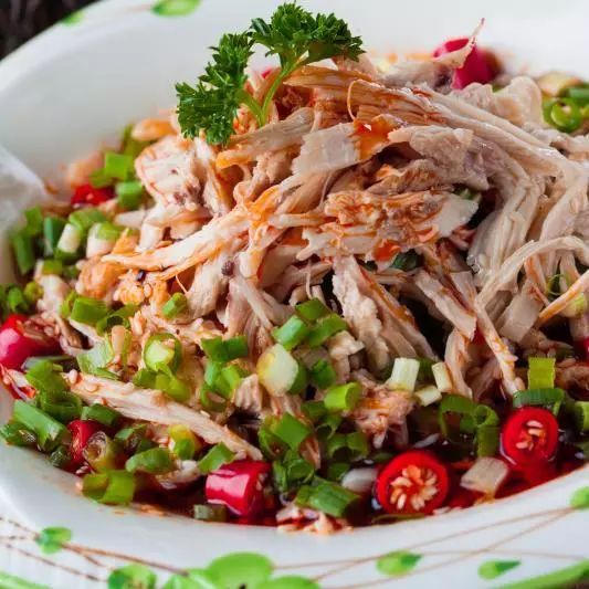 做法:熟鸡脯肉200克撕成细丝,放于盘中。香椿芽100克,洗净,放开水中加盖温浸5分钟,沥干切碎,放在鸡丝上,加入酱油、麻油、醋、精盐和味精,拌匀,腌渍入味即可食用。